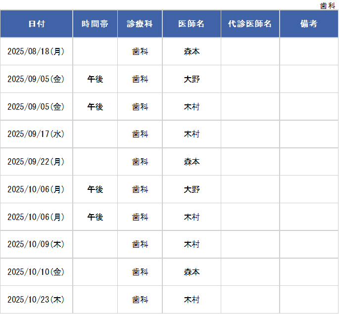 歯科口腔外科 外来診療表