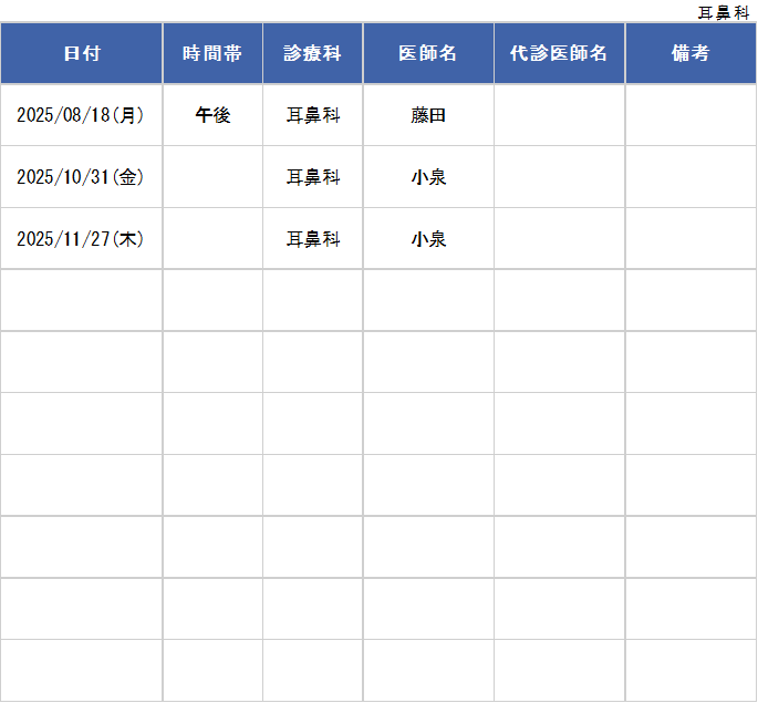 ホーム > 診療科・部門一覧 > 耳鼻咽喉科 頭頸部外科 > 外来診療表