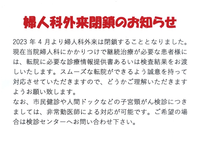 ホーム > 新着情報 > 婦人科外来閉鎖のお知らせ