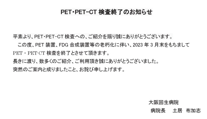 ホーム > 新着情報 > PET検査終了のお知らせ