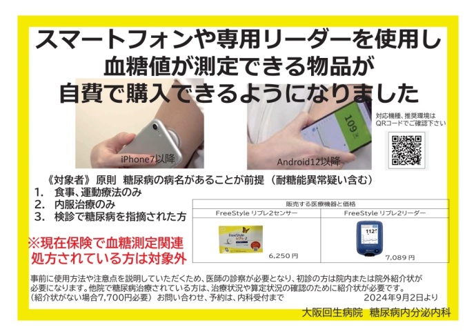 スマートフォンや専用リーダーを使用し血糖値が測定できる物品が自費で購入できるようになりました。