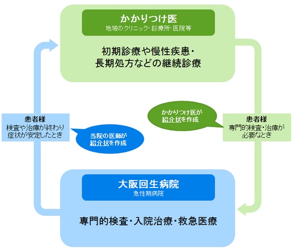 かかりつけ医が、“専門的検査や入院治療が必要である”、と判断した場合は紹介状を作成し、患者様はその紹介状を持って当院を受診します。そして、検査や治療を行い症状が安定された場合は、当院の医師が紹介状を作成して、かかりつけ医へ紹介し(逆紹介)、日常診療を継続します。